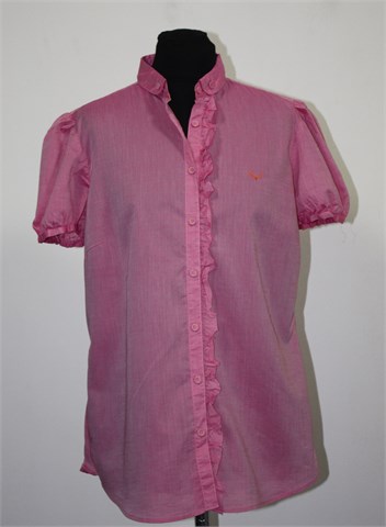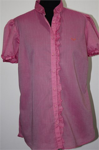 Sand Pink košulja sa kratkim rukavima, roze boje sa blagim sjajem. Prednje kopčanje (sa jedne strane ukrašeno volančićem), blago strukirana. Tanji i lagan pamuk.