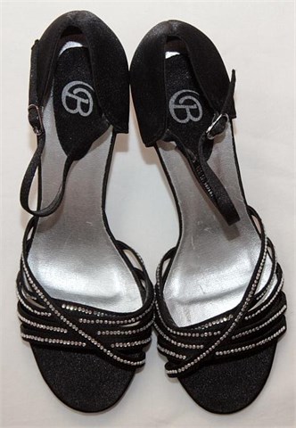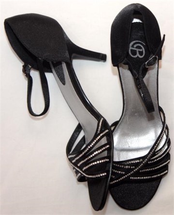 Sandale sa otvorenim prstima. Presvučene satenom, sa prednje strane trakice sa cirkonima. Gazište srebrne boje (umjetni materijali). Trakice oko gležnja.