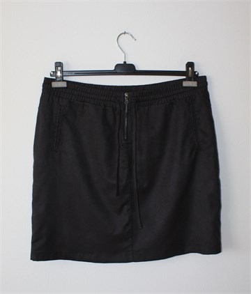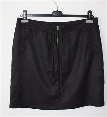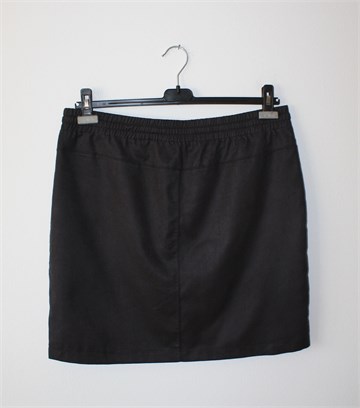 Sandwich suknja crne boje, materijal je imitacija brušene kože (sastav je poliester). Sa prednje strane cif i gumbić, u struku guma (prilagodljiva širina, vidjeti mjere) i vezica. Prednji bočni džepovi, podstavljena. Vrlo blago rastezljiva.