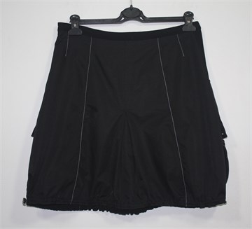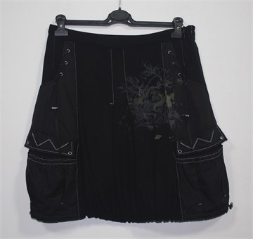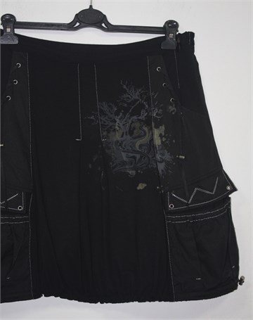 Sao Paulo prekrasna i neobična suknja crne boje sa prednjim printom i ukrasnim prošivima. Bočni džepovi, stegnuta gumicom na dnu (može se regulirati koliko će biti stegnuta). Prednji dio suknje je mekan viskozni materijal, bočni i stražnji dio je čvršći i blago sjajan materijal. Bočni cif.