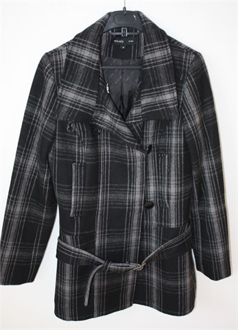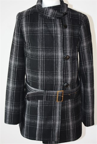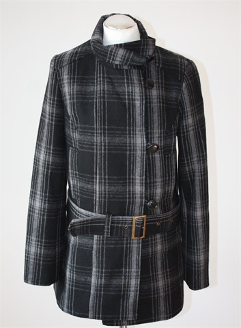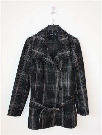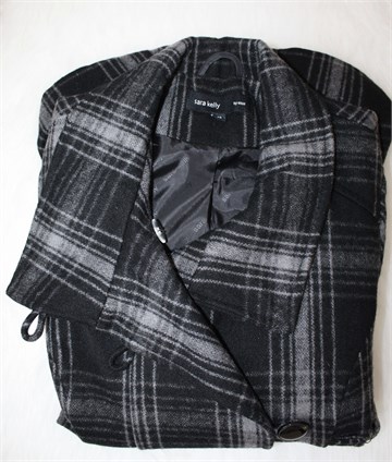 Sara Kelly kaput crno-sive boje sa uzorkom (vidljivo na slikama, siva boja je uživo tamnija nego na slikama). Prednje kopčanje, bočni džepovi, podstavljena. Uz kaput dolazi remen od istog materijala (nije nigdje pričvršćen i ne postoje ušice za remen).
