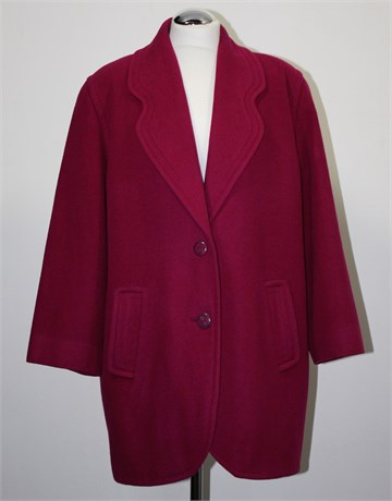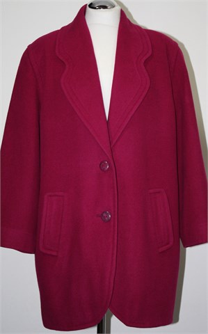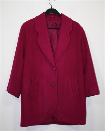 Schild kaput tamnije boje ciklame (uživo je boja više ciklamasta), srednje dužine. Prednje kopčanje sa ukrasnim gumbima, kosi bočni džepovi. Blagi jastučići u ramenima, podstavljen.
