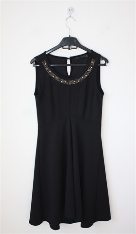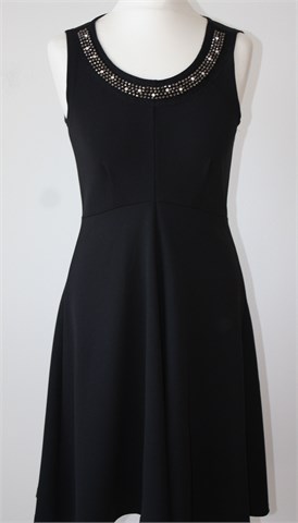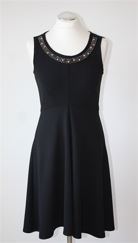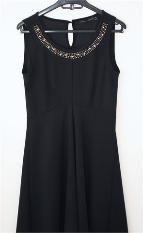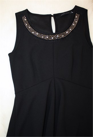 Seppala Woman haljina bez rukava, crne boje. Sa prednje strane našivene aplikacije, sa stražnje strane (na vratu) gumbić. Materijal srednje debljine, rastezljiv. Nešto duža sa stražnje strane (vidjeti mjere).
