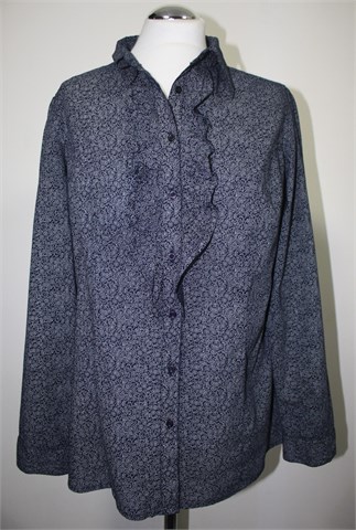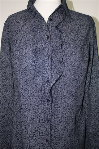 She košulja sa dugim rukavima, tamno plave boje sa bijelim uzorkom na tkanini. Prednje kopčanje na gumbe, ukrasni volančići oko kopčanja. Prednji i stražnji ušitci.