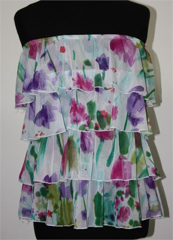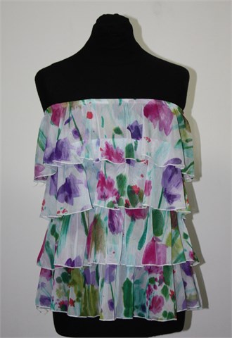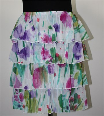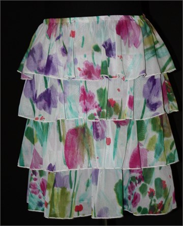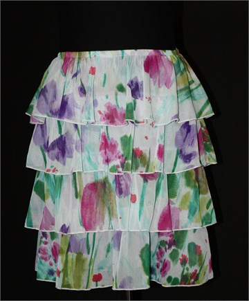 Silence+Noise suknja ili topić (može se nositi na oba načina) bijele boje sa cvjetnim printom. Napravljena u četiri reda volančića (jednaka s obje strane), u gornjem dijelu gumica pa je širina prilagodljiva. Materijal je kao mrežasti til, lagan i blago providan (nije podstavljena).