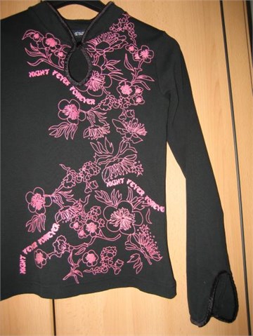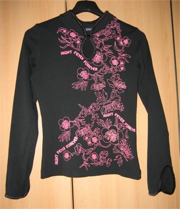Prekrasna majica crne boje, dugih rukava. Sa prednje strane šljokičavi print u rozoj boji. Visoki ovratnik sa gumbićem. Na rubovima ovratnika i na rukavima elastična sjajna traka. Prorezi na krajevima rukava.
