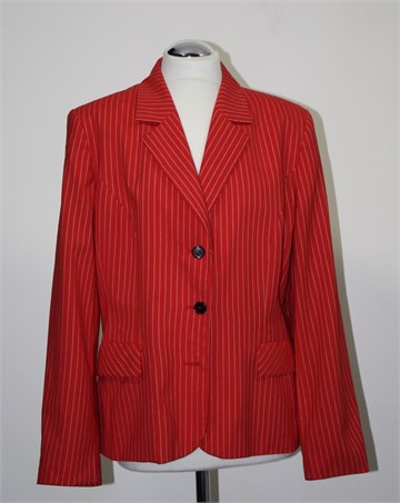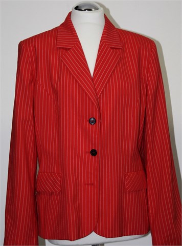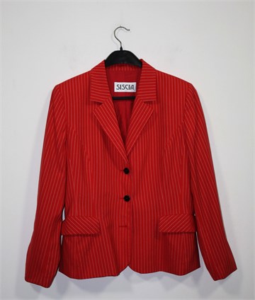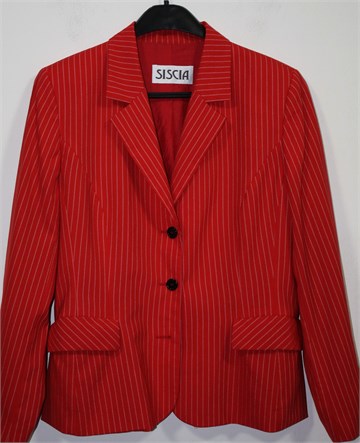Siscia sako crvene boje sa bijelim prugicama (boja uživo je nešto zagasitija nego na slici). Prednje kopčanje sa gumbima (jedan se odšio ali ima rezervne gumbe), jastučići u ramenima. Gumbići na krajevima rukava, podstavljena.
