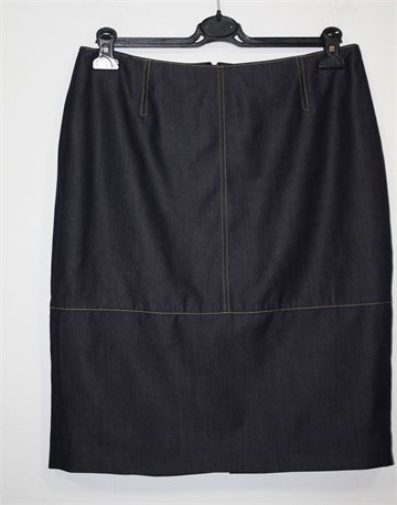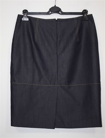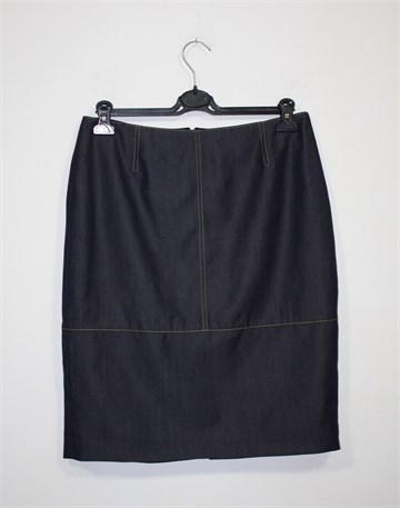 Siscia suknja plave boje (materijal djeluje kao tanji traper). Ukrasni ušitci sa prednje i stražnje strane, mali stražnji rasporak. Podstavljena (podstava ima par sitnijih oštećenja ali ništa vidljivo kada je nošena). Stražnji cif (malo se odšio šav na kraju cifa, isto nije jako vidljivo).