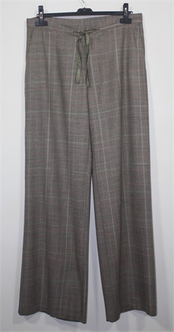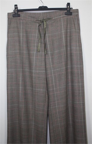 Sisley hlače klasičnog kroja sa širim nogavicama, kombinacija smeđe-bež boje sa uzorkom na tkanini (vidljivo na slici). Prednji cif i vezanje sa šljokavo-zlatnom vezicom, bočni džepovi. Bočno na nogavicama (sa vanjske strane) našivena takva ista šljokavo-zlatna traka (cijelom dužinom). Tanak i lagan štofasti materijal.