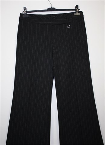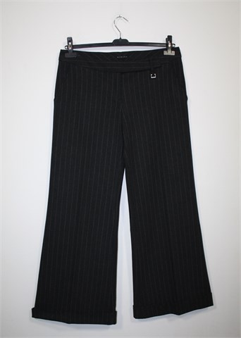Sisley hlače tamno sive boje sa bijelim diskretnim prugama. Prednji cif i kopčanje, prednji bočni džepovi. Mekani štofasti materijal, široke nogavice (na dnu nogavica mandžete - jedna se odšila ali bez problema se zašije). Blago rastezljive.