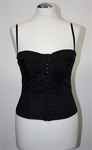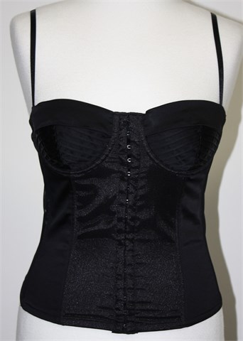 Predivan Sisley korzet crne boje sa prednjim kopčanjem (male kukice-kopčice). Podesive naramenice, dio iznad grudi je podstavljen (fiksno). Pojačan plastičnim žicama, materijal je rastezljiv i djelomično ukrašen tilom.