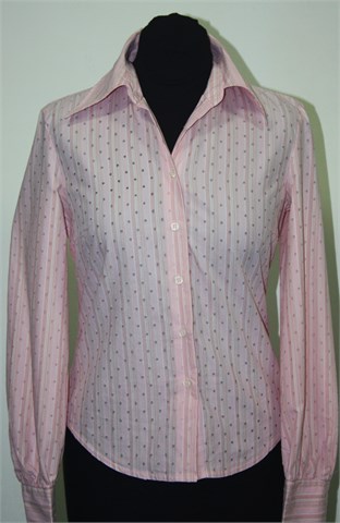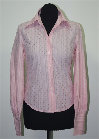 Sisley košulja sa dugim rukavima, bijele boje sa rozim prugama i točkastim uzorkom na materijalu. Prednje kopčanje, prednji i stražnji ušitci (strukirana). Lagan i čvrst materijal, nije rastezljiv.