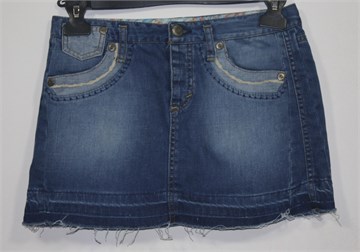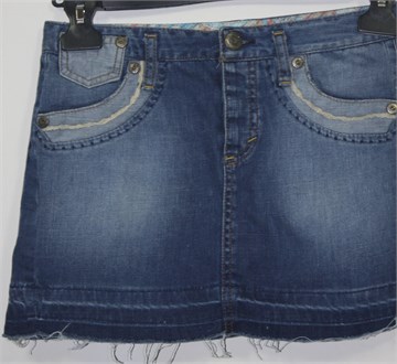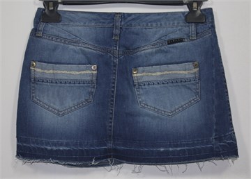 Sisley kratka suknja od trapera, mjestimično iscufanog, poderanog i izlizanog izgleda (tvornički). Prednji cif i kopčanje, pasica za remen. Ukrasni prošivi na džepovima, otvoreni šavovi na dnu suknje (tvornički).