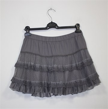 Sisley suknja sive boje, vanjski sloj je kombinacija sivog materijala i mrežastog tila sive boje sa ukrasnim trakicama na rubovima. Unutarnji dio (podstava) je pamučni materijal sive boje. Gumica u struku (širina je vrlo prilagodljiva). Lagana i prozračna.