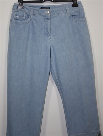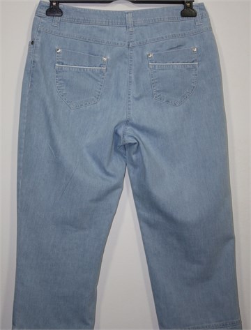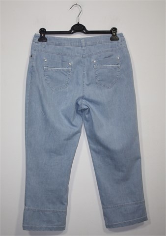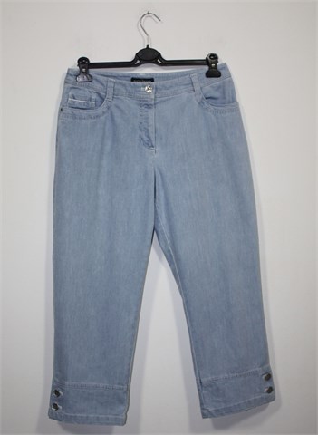 Sixth Sense (C&A) poluduge traper hlače (duže - vidjeti mjere), svijetlo plave boje. Prednji cif i kopčanje, pasica za remen. Prednji i stražnji klasični džepovi. Gumbići na krajevima nogavica. Nisu rastezljive.