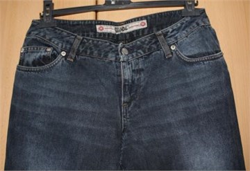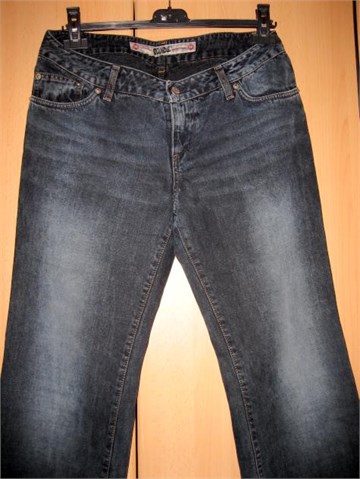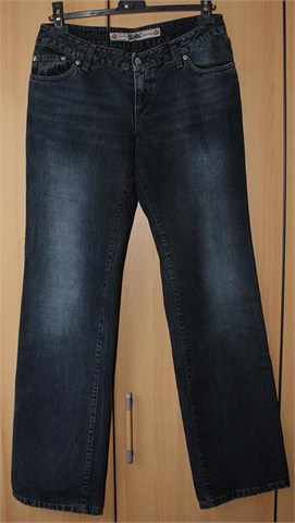 Veličina piše 32/46 (vidjeti mjere). Tamno plave boje, na nekim mjestima efekt istrošenosti. Ravne nogavice. Prednji i stražnji džepovi. Prednji cif i kopčanje, pasica za remen. Nisu rastezljive.