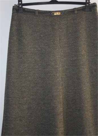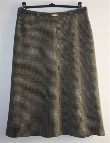 Slacks (made in Switzerland) suknja prošarane boje (prevladavaju crna, bež i zelena). Stražnji cif i kopčica, pasica za remen sa ukrasnim tankim remenčićem sa zlatnom kopčicom. A kroj, suknja se prema dnu blago širi. Topli materijal, kao tanji tvid (ili štof). Nije podstavljena.