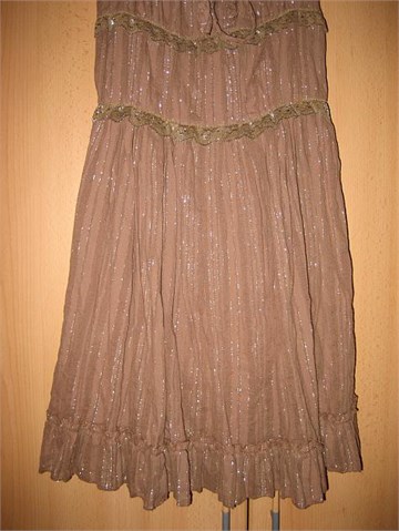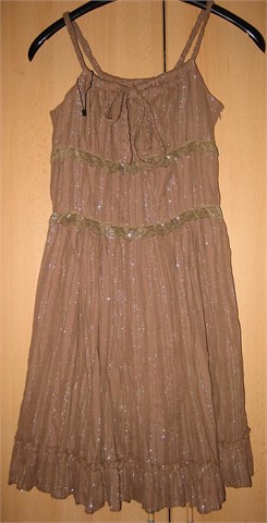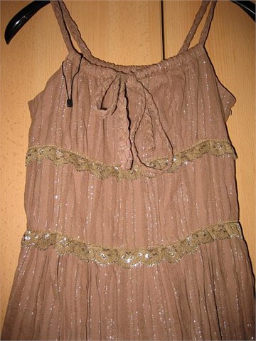 Lagan i prozračan pamuk. Podstavljena cijelom dužinom. Isprepletene naramenice, mogu se stegnuti po želji. Bočni cif. Strukirana. Otraga izgleda identično kao i naprijed. Kroz cijelu haljinu (i naramenice) protkane su srebrne niti.