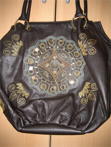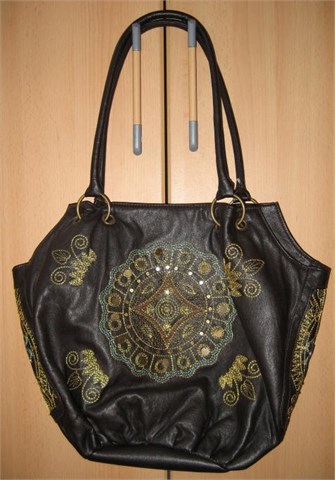 Imitacija kože, velika i prostrana sa dugačkim ručkama, aplikacije na prednjoj strani i sastrane na obje strane, zip za zatvaranje, podstavljena, dva unutarnja džepića