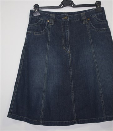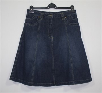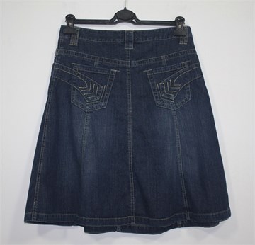 SoSoire suknja od trapera srednje plave boje mjestimično ispranog izgleda. Prednji cif i kopčanje, pasica za remen. Prednji bočni džepovi (po dva sa svake strane), stražnji ukrašeni aplikacijama od konca.