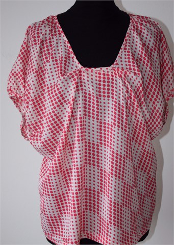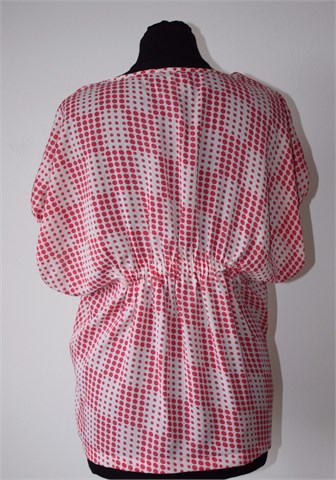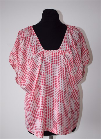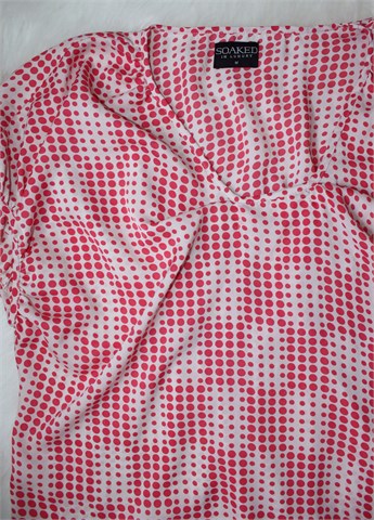 Soaked in Luxury bluza sa kratkim rukavima, bijele boje sa rozim točkicama. Tanja i lagana, moguće providna. Gumica na leđima (vidljivo na slici).