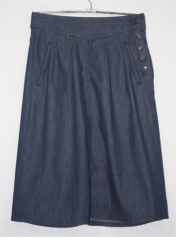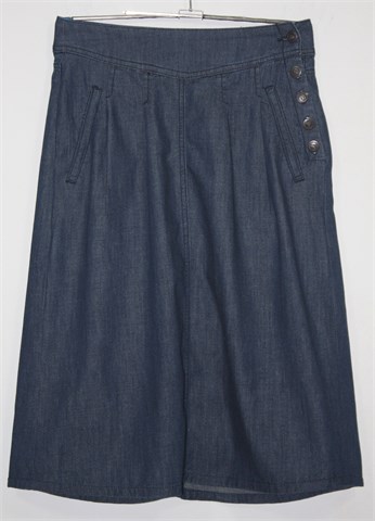 Soft Grey (La Redoute) suknja od tanjeg i laganog trapera. Bočni džepovi, bočno kopčanje sa ukrasnim gumbima. Ukrasne faldice sa prednje i stražnje strane.
