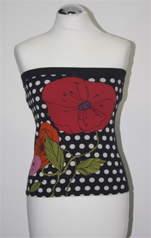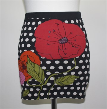 Soochi (UK) suknja ili topić crne boje sa točkastim i cvjetnim printom sa prednje strane. U gornjem šavu je rastezljiva gumica pa je širina prilagodljiva. Mekan i rastezljiv pamuk.