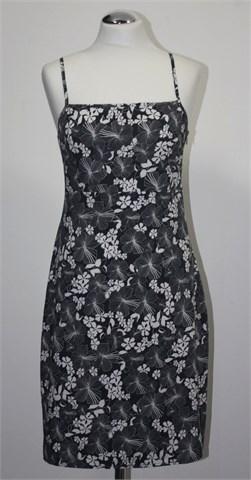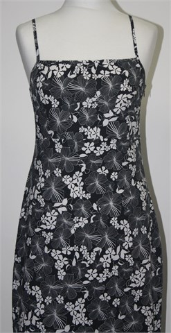 Soon haljina sa tankim fiksnim naramenicama, crne boje sa bijelim cvjetnim printom (uzorak kao na slikama). Bočni cif, rezana ispod prsiju. Tanji i rastezljiv materijal, odlično se prilagođava tijelu.