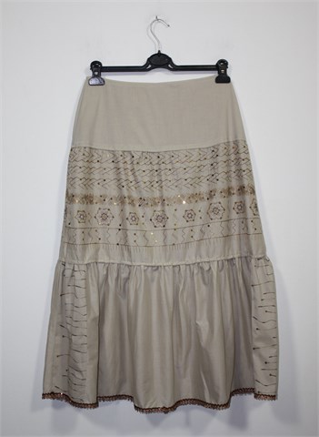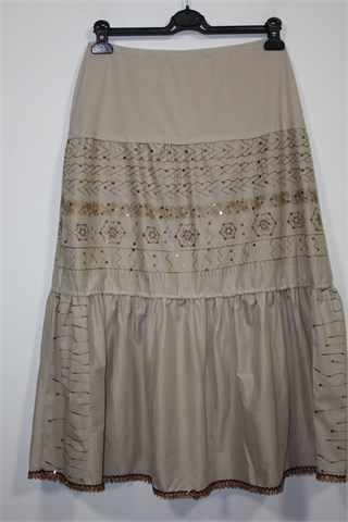 Sophie Faroh pamučna duža suknja bež boje, aplicirana ukrasnim smeđe-zlatnim koncem i zlatnim šljokicama. Stražnji cif, podstavljena. Lagan pamuk, vrlo kvalitetan.