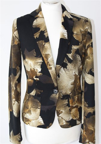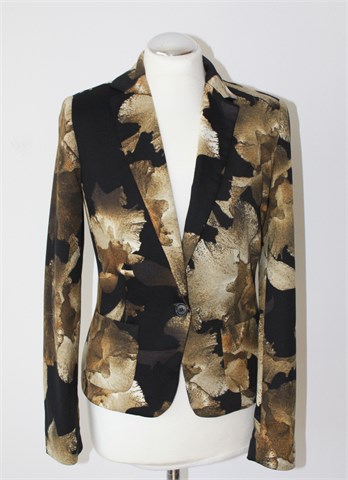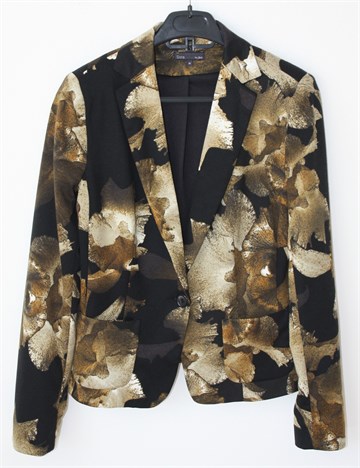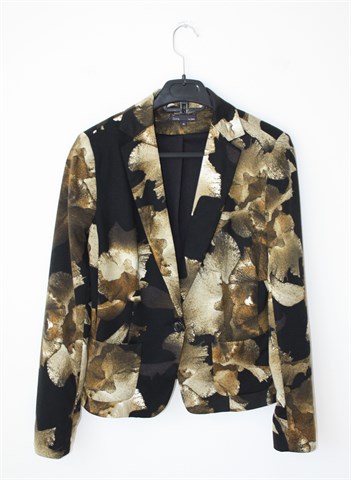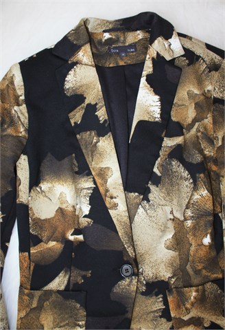Sora by jbc sako/blazer crne boje sa printom (boje i uzorak printa vidljivi na slikama). Prednje kopčanje sa jednim gumbom, bočni džepovi. Jastučići u ramenima, podstavljen. Rastezljiv.
