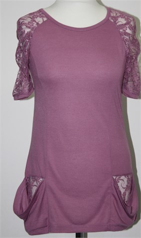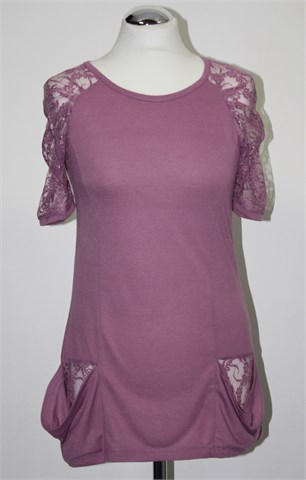 South majica tamnije pastelno roze boje (recimo tamnije lila nijansa) sa kratkim čipkastim rukavima. Bočni otvoreni džepovi podstavljeni sa čipkom (vidljivo na slici). Mekan i rastezljiv materijal.