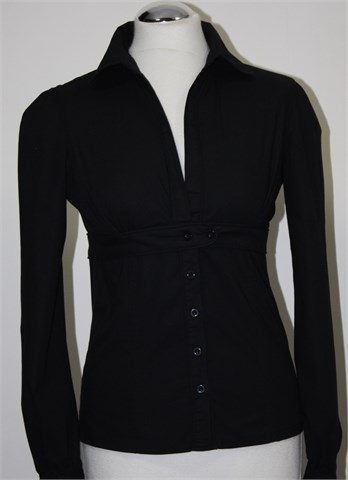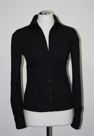 Specchio košulja sa dugim rukavima, crne boje. Prednje kopčanje, rezana ispod prsiju. Blago rastezljiva, strukirana.