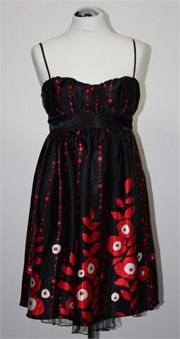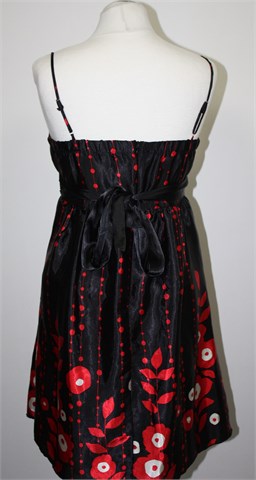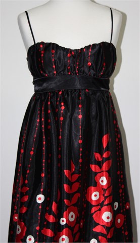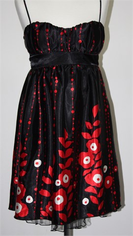 Speechless haljina crne boje sa crveno-bijelim printom. Tanke naramenice (kopčice za prilagođavanje su pukle pa bi naramenice trebalo zašiti na željenu dužinu), bočne trake za vezanje sa stražnje strane. Dio iznad grudi je spužvasto podstavljen pa nije potrebno nositi grudnjak. Podstavljena, na dnu podstave je našiven til koji proviruje na dnu haljine. Lagan i na dodir svilenkast materijal. Stražnji cif, na leđima je našivena gumica pa je širina prilagodljiva.