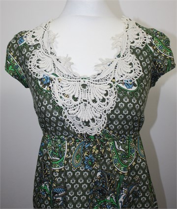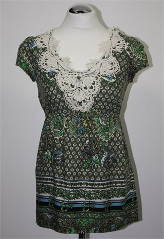 Speckless bluza sa kratkim rukavima, zelene boje sa šarenim uzorkom (boje i uzorak vidljivi na slikama). Sa prednje strane (oko dekoltea) heklana aplikacija od konca, u struku stegnuta gumicom. Materijal je tanji, mekan i nerastezljiv.