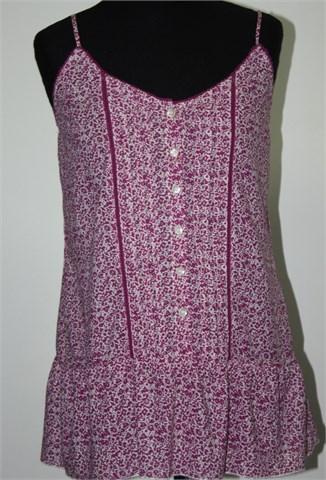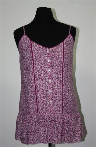 Springfield bluza/topić bijele boje sa svijetlo ljubičastim printom. Tanke fiksne naramenice, ukrasno kopčanje sa prednje strane. Stražnji gornji rub je rastezljiv. Materijal je lagan i tanak.