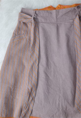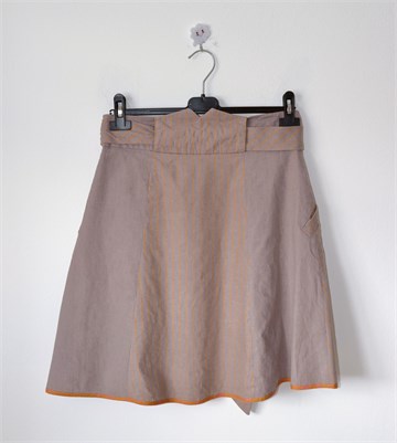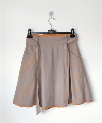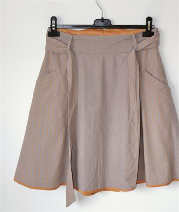 St-Martins suknja sivo-smeđe boje, materijal je mjestimično prugast (narančaste pruge), obrub i unutrašnjost pasice materijal prošarano narančaste boje. Bočni cif, pasica za remen sa pripadajućim remenom (može se izvaditi). Prednji bočni džepovi, postavljena.