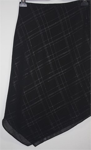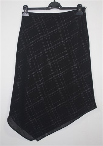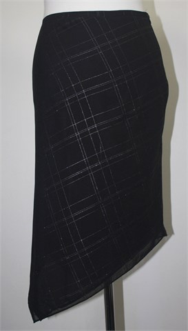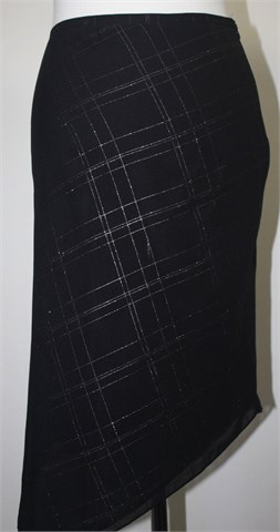 Stefanel suknja asimetričnog kroja (krojena u koso), crne boje sa srebrnim, blago šljokavim prugama. Bočni cif, podstavljena. Lagan i prozračan materijal, blago rastezljiv.