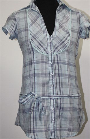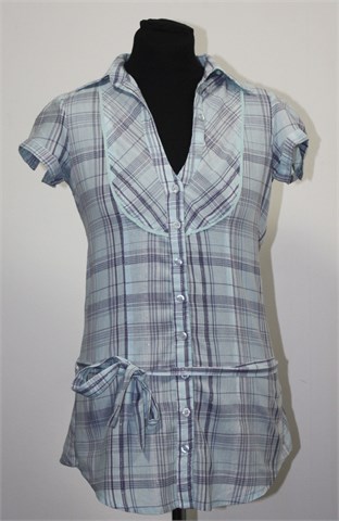 Stradivarius duža košulja sa kratkim rukavima, svijetlo plave boje sa prugasto-kariranim uzorkom (mjestimično su utkane sjajne niti). Prednje kopčanje, bočne ušice za remen sa pripadajućim remenom (može se skinuti). Mekan, tanak i vrlo lagan pamuk.