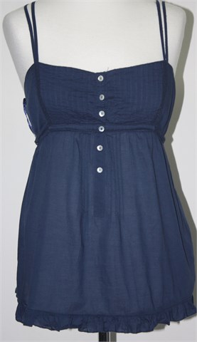 Stradivarius topić/bluza bez rukava tamno plave boje. Ispod prsiju i na leđima rastezljiva gumica pa je širina prilagodljiva. Vezice za vezanje sa stražnje strane, ukrasni prošivi i kopčanje sa sedefastim gumbima. Vrlo lagan i prozračan materijal.