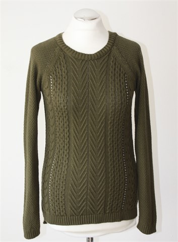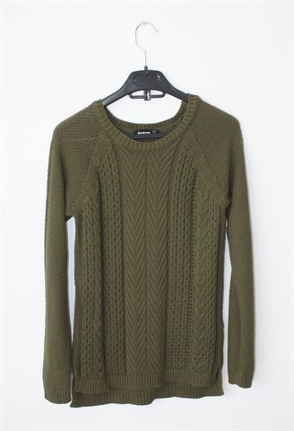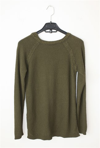Stradivarius pamučna vesta/pulover maslinasto zelene boje. Pletivo srednje debljine, rastezljivo. Bočni rasporci, nešto duža sa stražnje strane (vidjeti mjere).