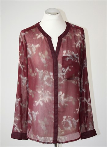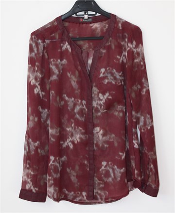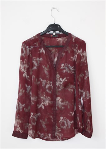 Street One košulja bordo boje sa uzorkom (boje i uzorak vidljivi na slikama), materijal oko ruba rukava i kopčanja je blago šljokav. Prednje skriveno kopčanje, džepić na prsima. Rukavi se mogu nositi i kao kraći (gumbić sa vanjske strane rukava i vezica unutar rukava). Tanji i lagan materijal, providan i rastezljiv.
