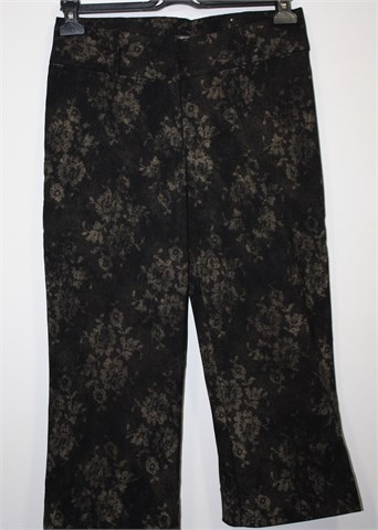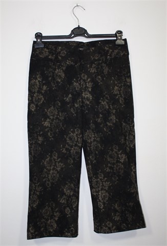 Street One poluduge hlače (skraćene iz dugih) crne boje sa cvjetnim čipkastim printom u bež boji. Prednji cif i kopčanje, široka pasica za remen. Vrlo rastezljive.