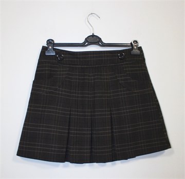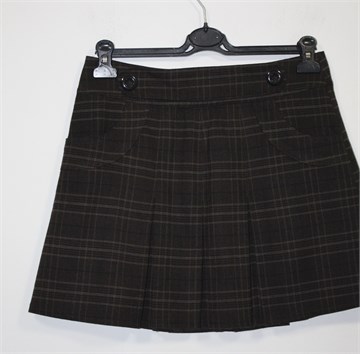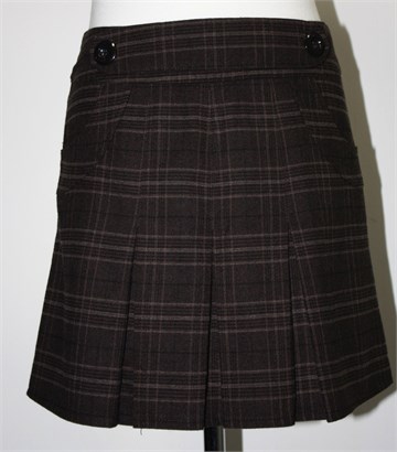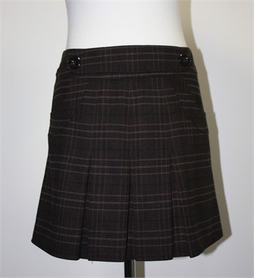 Street One suknja tamno smeđe boje sa prugasto-kariranim uzorkom (vidljivo na slikama). Prednji bočni džepovi, falde sa prednje i stražnje strane. Ukrasni remenčić sa prednje strane pasice, stražnji cif. Podstavljena.