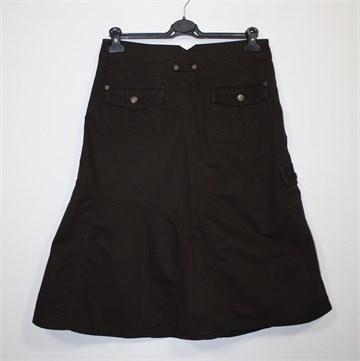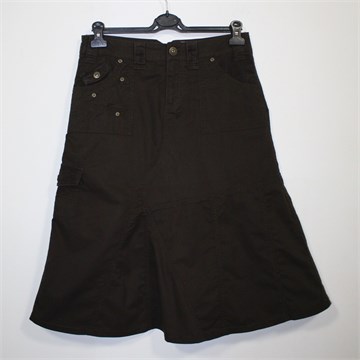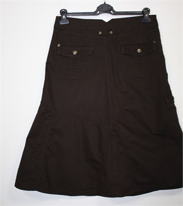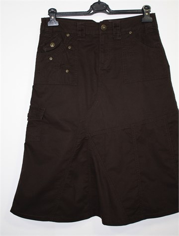 Street One pamučna suknja tamno smeđe boje, cargo kroja. Prednji bočni džepovi, stražnji na preklop sa gumbićem i jedan džep na boku. Na džepovima ukrasi od samta. Prednji i stražnji ukrasni prošivi, prema dnu suknja se širi.