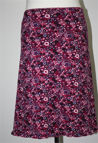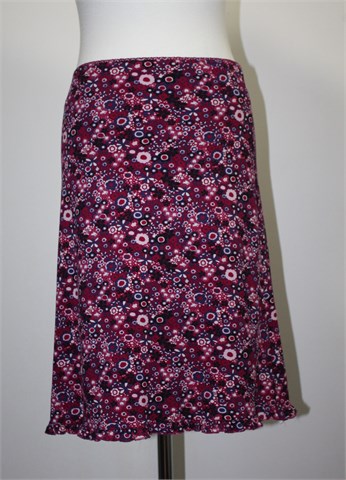 Street One suknja tamnije boje ciklame sa cvjetnim printom. Gumica u struku pa je širina prilagodljiva, našiven mali volančić na dnu suknje. Podstavljena. Mekana i rastezljiva.