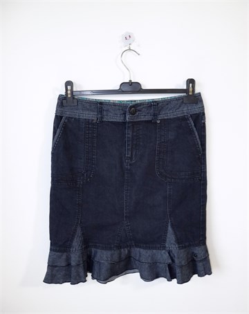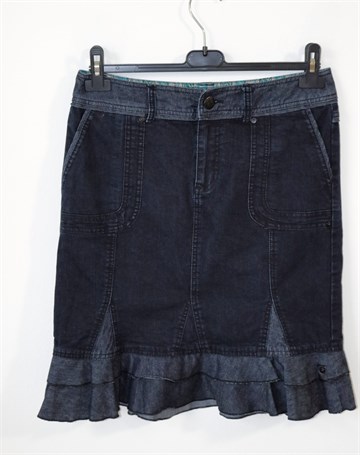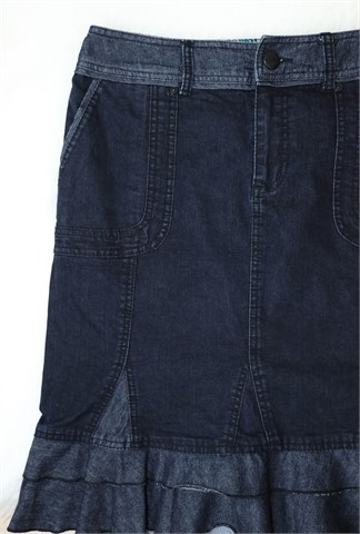 Street One traper suknja tamno plave boje (pasica i volančići na dnu suknje drugačije nijanse plave boje). Prednji cif i kopčanje, prednji džepovi. Tanji i rastezljiv traper.
