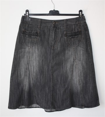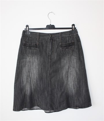 Street One traper suknja sive boje, mjestimično isprani/used look. Prednji cif i kopčanje, pasica za remen. Prednji mali džepići, stražnji skriveni. Nije rastezljiva.