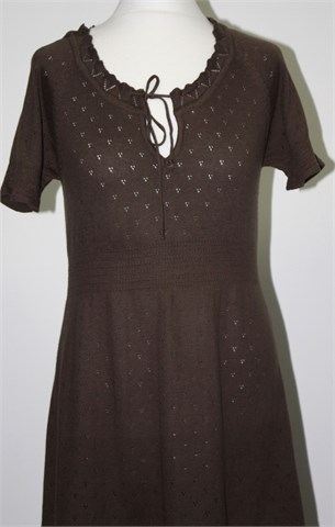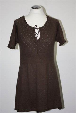 Street One duža vesta/tunika sa kratkim rukavima, smeđe boje. Vezica oko prednjeg otvora, blago stegnuta gumicama ispod prsiju i na krajevima rukava. Blago rupičasti uzorak na pletivu. Mekana, tanja i rastezljiva.