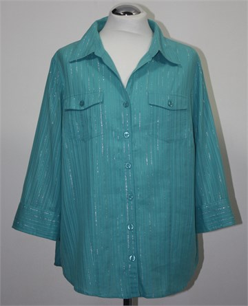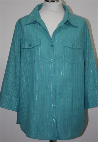 Style&Co košulja sa poludugim rukavima tirkizno plave boje, prošarana prugama i srebrnim prugastim nitima. Prednji ušitci za grudi, stražnji klasični ušitci na leđima (blago strukirana). Prednje klasično kopčanje, džepići na preklop sa gumbićem na prsima. Na krajevima rukava po dva gumbića. Lagan i ugodan pamuk :)