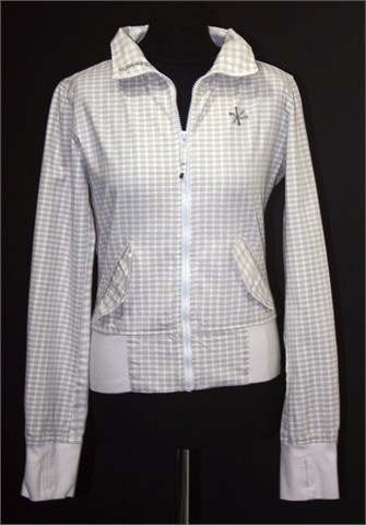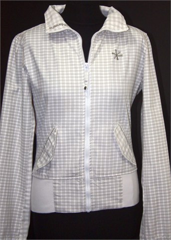 Sublevel pamučna jakna bijele boje sa prugama i detaljima u sivoj boji. Prednji cif, bočni džepovi sa preklopom i drukerom. Stegnuta pri dnu pasice i na krajevima rukava.